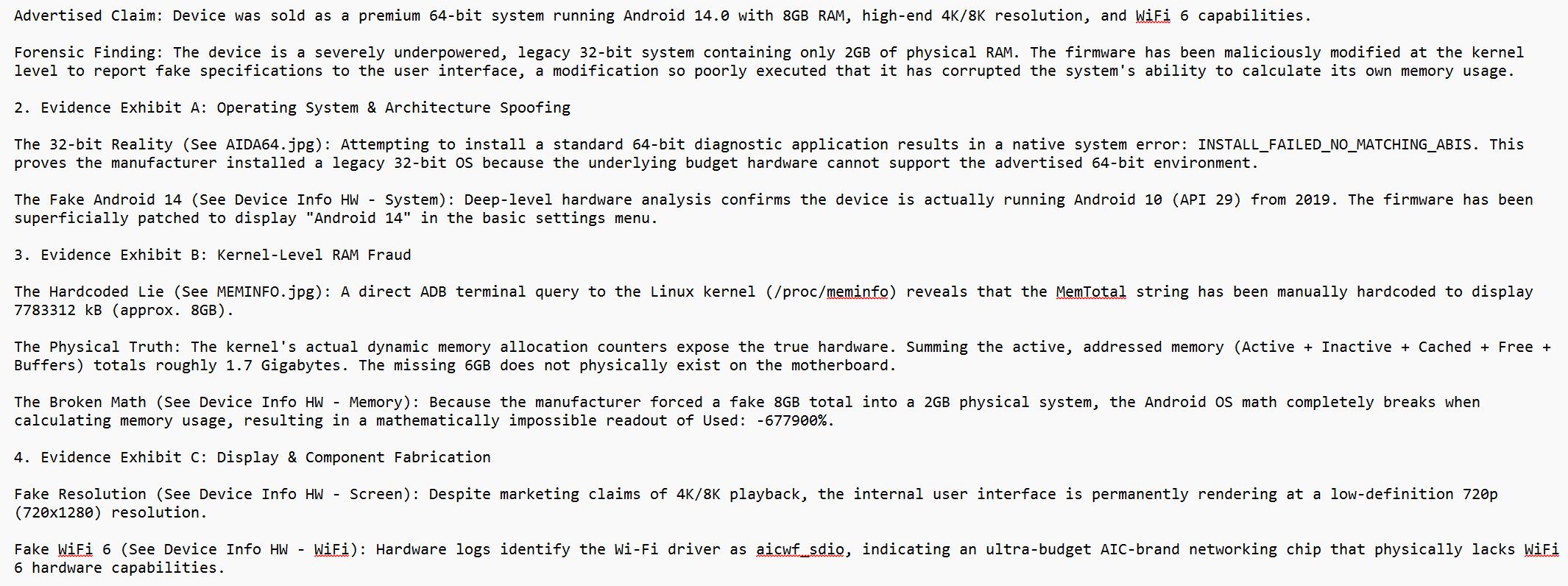 Advertised Claim: Device was sold as a premium 64-bit system running Android 14.0 with 8GB RAM, high-end 4K/8K resolution, and WiFi 6 capabilities.